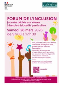- Tout au long de la journée // Stands des partenaires :CRA (Centre ressources autisme) ; AFEhP (Association française pour les enfants à haut potentiel) ; APADHE 59 et 62 / Association PEP 62 et APAJH Nord (Service d’accompagnement pédagogique à domicile, à l’hôpital ou à l’école) ; Association Phobie scolaire ; APEDYS (Association de parents d’enfants dyslexiques) ; Dyspraxie France Dys ; Avenir Dysphasie ; Corneille : le pouvoir de la lecture ; VirtySens ; Pôle pilote 100% IDT ; Pôle d’appui à la scolarisation (circonscriptions Avesnes / Valenciennes et Douai / Cambrai).