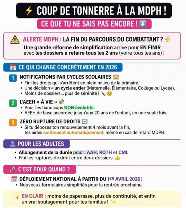 Voir l’ensemble des 18 mesures proposées à compter de septembre 2026 : du bon sens/ une diminution de la charge administrative… voir https://handicap.gouv.fr/sites/handicap/files/2025-07/Dossier-presse-Restitution-Tour-France-des-solutions-juillet-2025.pdf